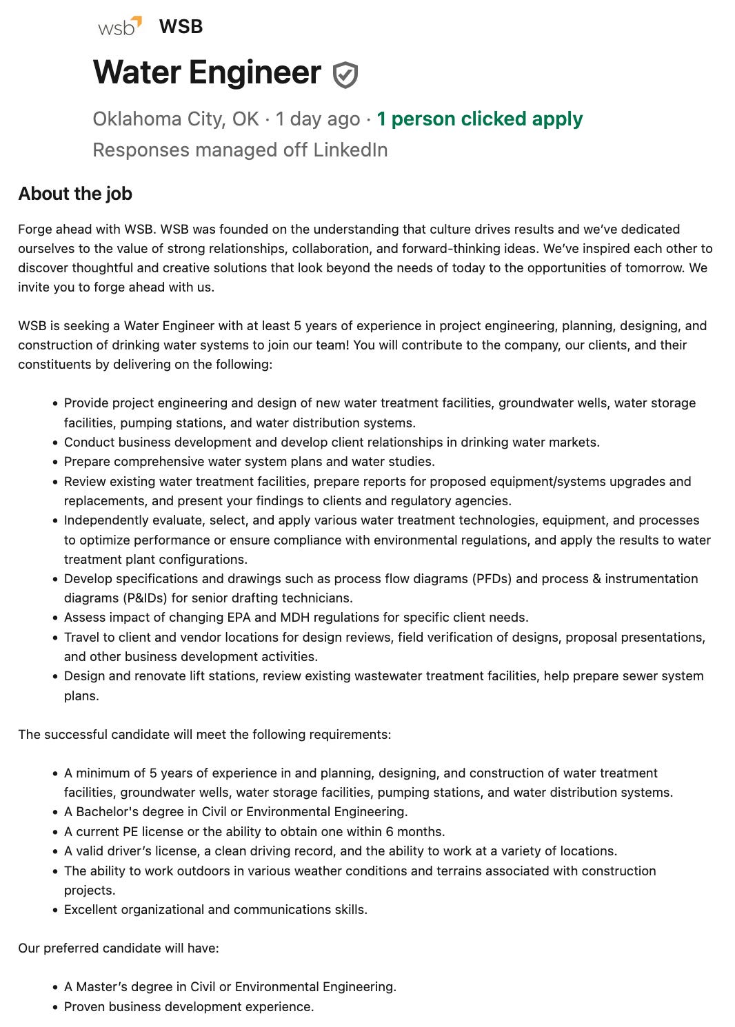 Logan County’s federally declared urbanized areas, though modest compared to Tulsa, fall under this mandate, prompting Cole and Sharpton to propose hiring WSB Engineering for a minimal SWMP. Cole insists that WSB, a Minnesota-based firm with an Oklahoma City office, is the only vendor capable, justifying a sole-source contract that sidesteps competitive bidding under 19 O.S. §1505(B)(6). WSB’s LinkedIn job posting on June 12, 2025, seeking a Water Engineer with expertise in “comprehensive water system plans” and CWA compliance, suggests the firm anticipates a boom from Oklahoma’s MS4 mandates. Posted just a day before this board meeting, this timing fuels suspicions of a prearranged deal, providing additional support for Chairman Piercy’s call to resist federal overreach and protect Logan County’s autonomy.